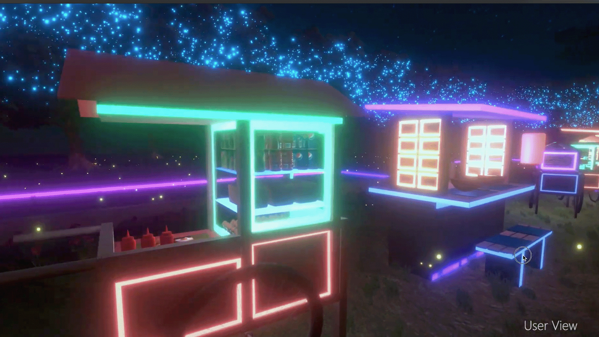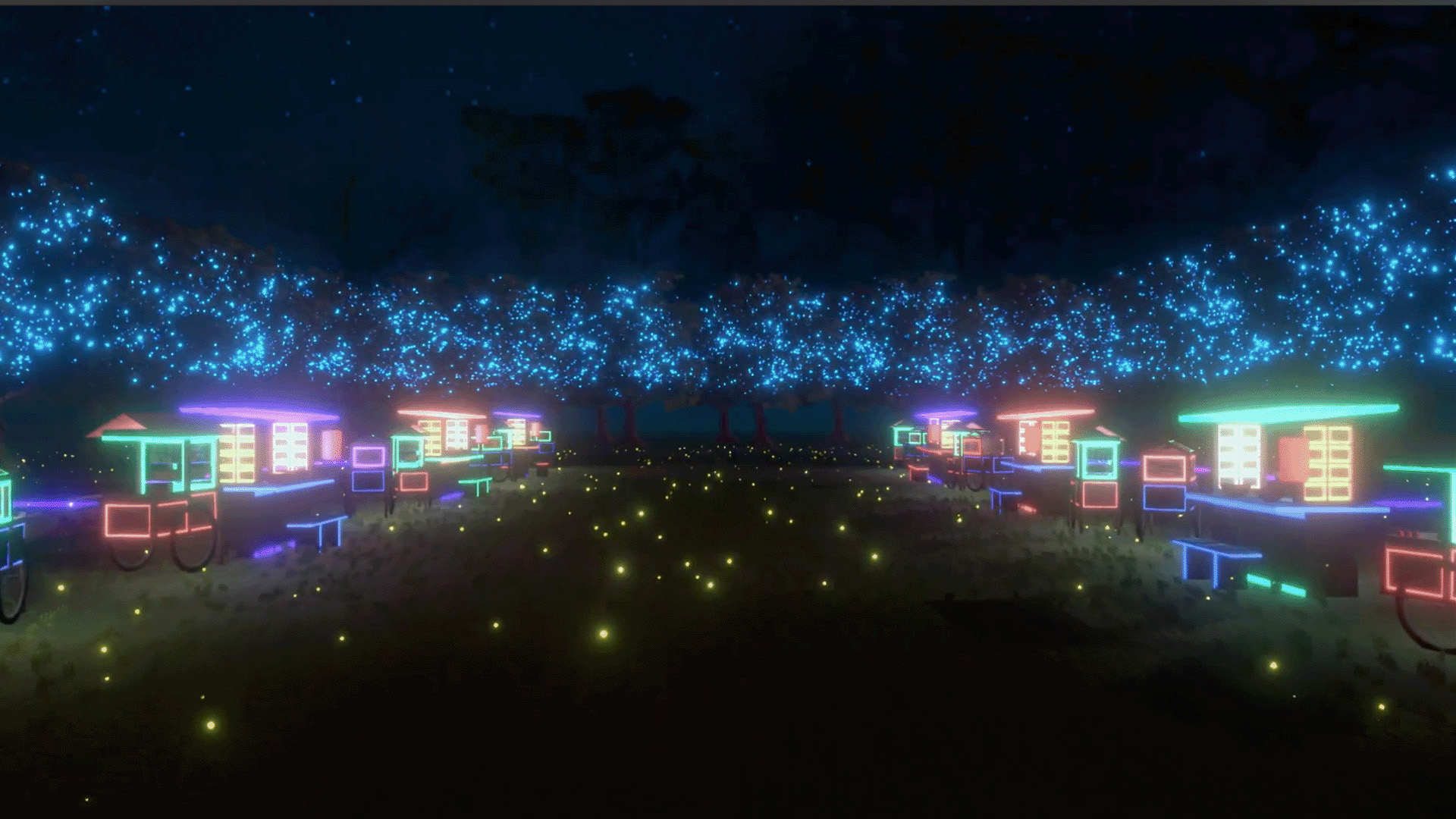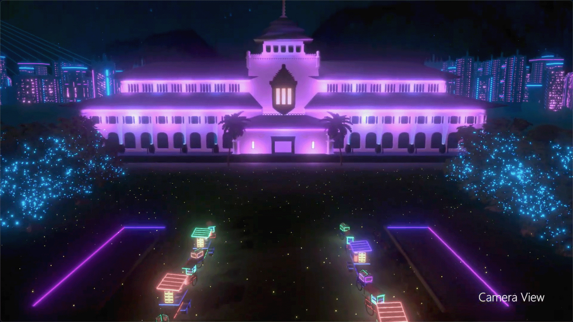 A virtual world inspired by a cyberpunk aesthetic featuring the iconic